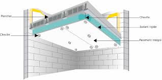 L’isolation entre un plancher au rez-de-chaussée et une cave, un garage ou sous-sol permet de limiter les déperditions thermiques, en posant des panneaux isolants sur le plafond de l’espace non chauffé.